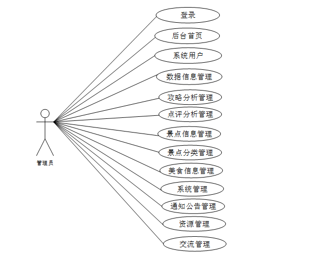 系统的用例展示的是系统功能与用户之间的关系,通过用例的方式能够直观的展示出来,本旅游数据分析与可视化系统开发的完整UML用例图分别是图2-1、图2-2。