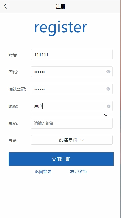 不是基于SSM的空巢老人健康小程序的用户可以通过微信小程序在线进行注册,填写上自己的账号、密码、重复密码、昵称、邮箱登信息后点击“提交”按钮后将会验证是否有非空数据,再验证密码和重复密码是否一样,最后验证是否账号重复,都验证没问题后即可注册成功。注册实现了用户注册和发布者注册两部分,其用户注册界面展示如下图4-1所示。