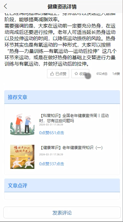 用户点击健康资讯按钮,可以进入健康资讯列表,点击感兴趣的健康资讯,进入健康资讯详情页面,用户可以进行查看、点赞、收藏、评论等操作,界面如下图4-4所示。