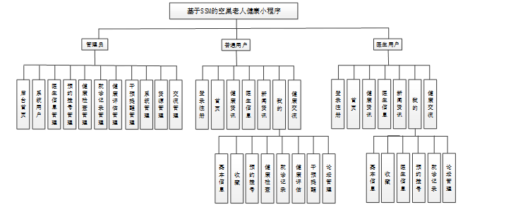 通过对基于SSM的空巢老人健康小程序的功能需求分析以及用例分析,得出了基于SSM的空巢老人健康小程序的功能模块图如图3-1所示。