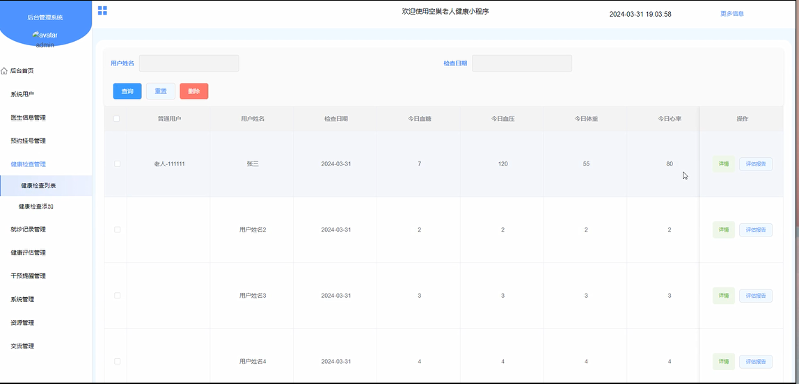 基于SSM的空巢老人健康小程序可在微信端实现登录注册、首页、医生信息、健康资讯、健康交流、我的(基本信息、收藏、预约挂号、健康检查、就诊记录、健康评估、干预提醒、论坛管理)等操作,相对于传统空巢老人健康管理方式,基于SSM的空巢老人健康小程序提高了效率和便利性。在后台可对系统用户、医生信息、预约挂号、健康检查、就诊记录、健康评估、干预提醒、系统轮播图、健康资讯、交流论坛等进行管理,充分了解用户的需求,更有针对性的服务用户。