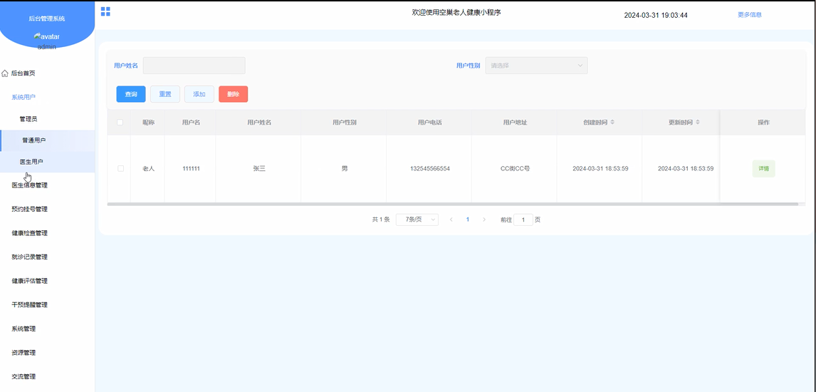 管理员点击“系统用户”这一菜单会显示管理员、普通用户、医生用户用户这三个子菜单,管理员可以对这三个角色的信息进行增删改查操作。界面如下图4-12所示。