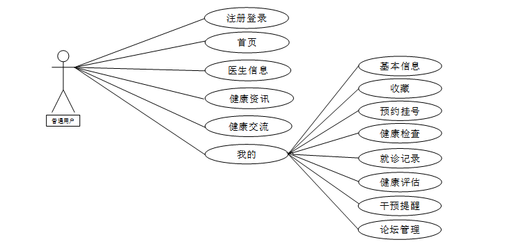 普通用户角色的用例包括登录注册、首页、医生信息、健康资讯、健康交流、我的(基本信息、收藏、预约挂号、健康检查、就诊记录、健康评估、干预提醒、论坛管理)。
