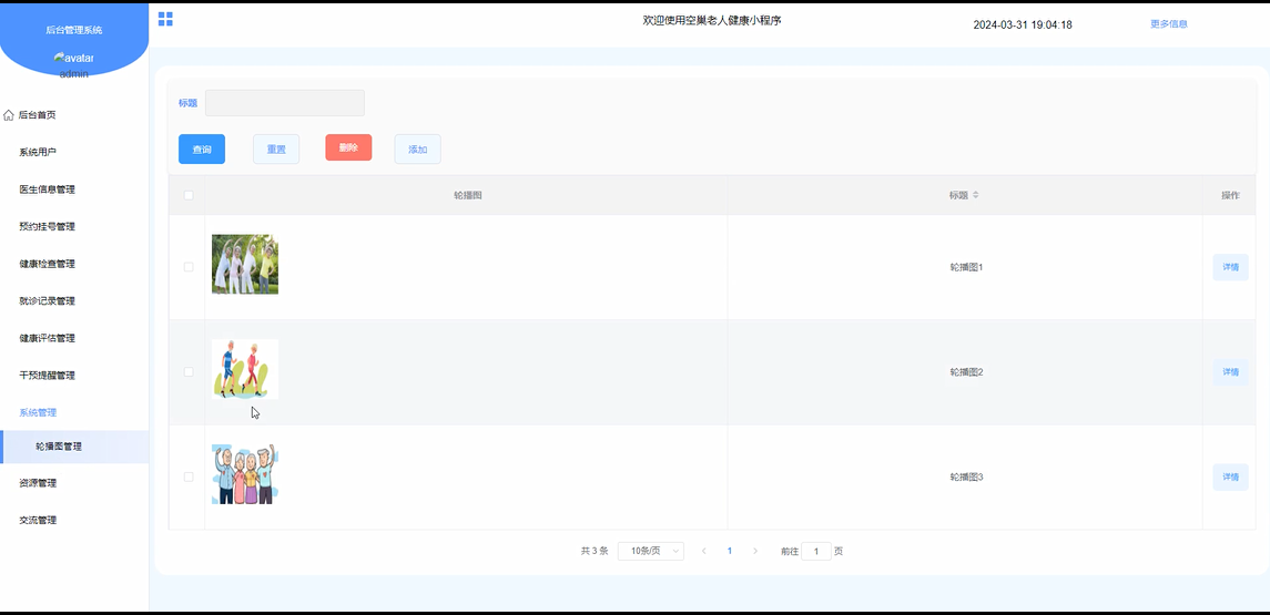 管理员点击“系统管理”这一菜单会显示轮播图这一个子菜单,管理员可以对前台展示的轮播图进行设置,界面如下图所示。