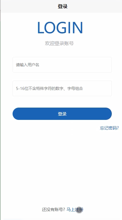 微信小程序上注册后的用户可以通过自己的用户名和密码进行登录,在用户填写好自己的用户名和密码信息并点击“登录”按钮后,将会先验证是否有非空数据,再验证填写的用户信息和数据库中保存的是否一致,一致后将会登录成功,登录成功后将会在左上角上显示用户信息;否则将会提示相应错误信息,用户登录界面如下图4-2所示。