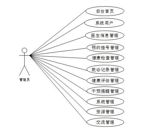 管理员角色的用例包括后台首页、系统用户、医生信息管理、预约挂号管理、健康检查管理、就诊记录管理、健康评估管理、干预提醒管理、系统管理(轮播图管理)、资源管理(健康资讯、资讯分类)、交流管理(论坛列表、论坛分类列表)。