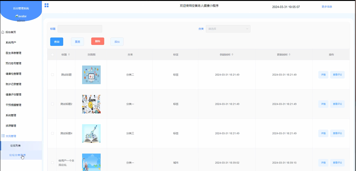 点击“交流管理”这个菜单,可以管理健康交流论坛的帖子发布、编辑和删除等操作,还可以对论坛帖子进行分类管理,确保论坛的秩序和质量。交流管理界面如下图所示。
