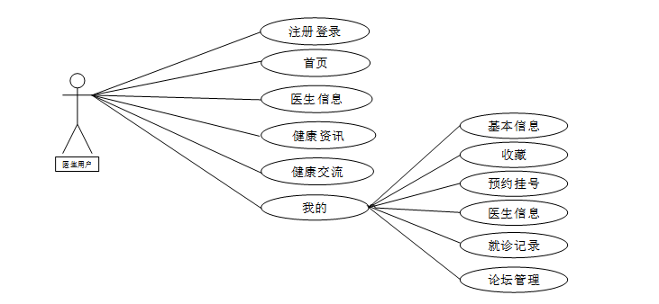 医生用户角色的用例包括登录注册、首页、医生信息、健康资讯、健康交流、我的(基本信息、收藏、医生信息、预约挂号、就诊记录、论坛管理)。
