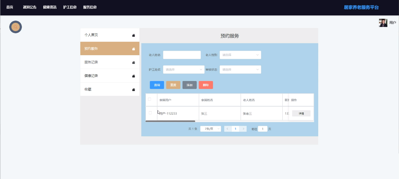 用户通过登录后台,查看首页、通知公告、健康资讯、护工信息、服务信息、我的账户、个人中心(个首页、预约服务、服务记录、健康记录、收藏)等详细信息,如图4-7所示,以便更好地了解自身的情况。