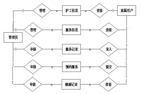 对于一个要开发的系统来说,E-R图可以让别人能更快更轻松的了解此系统的事务及它们之间的关系。根据系统分析阶段所得出的结论确定了在养老院管理系统中存在着多个实体分别是护工信息、服务信息、预约服务、服务记录、健康记录等。