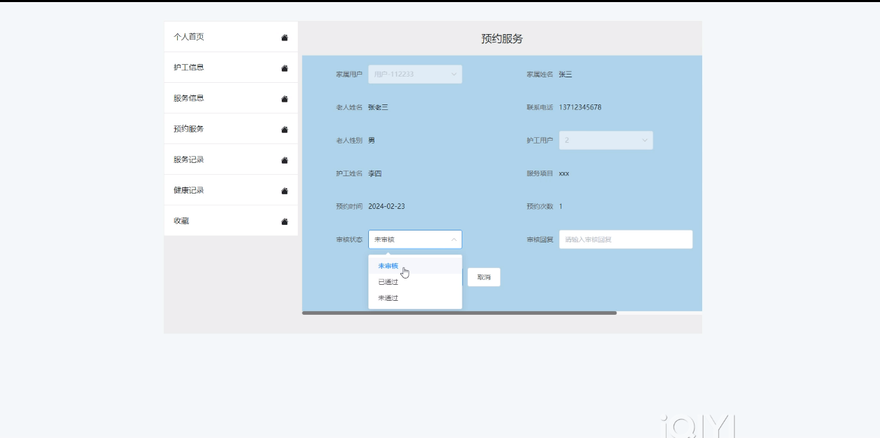 预约服务管理,护工用户可以查看预约服务管理详细信息,可以进行增删改查等操作,如图4-12所示