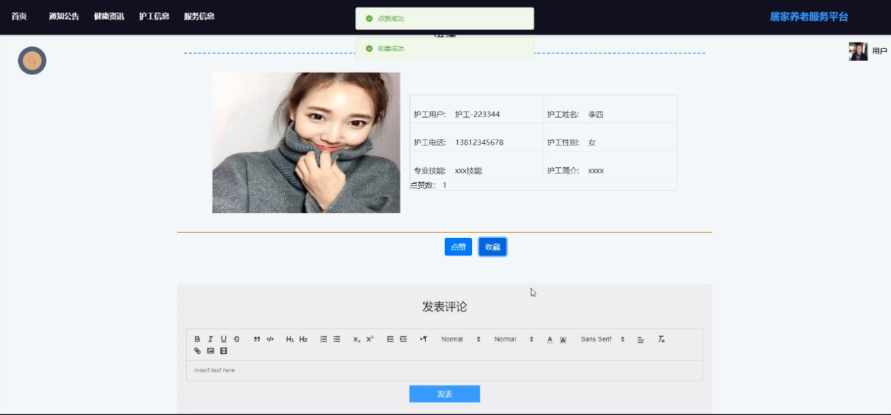 护工信息,可以查看护工信息详细信息,可以进行点赞、收藏、评论等操作,详情请参见图4-8。