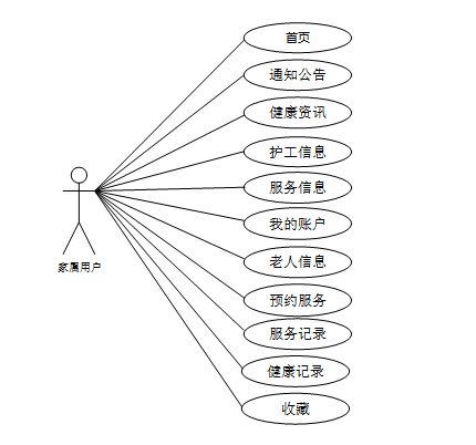 家属用户主要功能:首页、通知公告、健康资讯、护工信息、服务信息、我的账户、个人中心(个首页、预约服务、服务记录、健康记录、收藏)等,家属用户用例如图2-4所示。