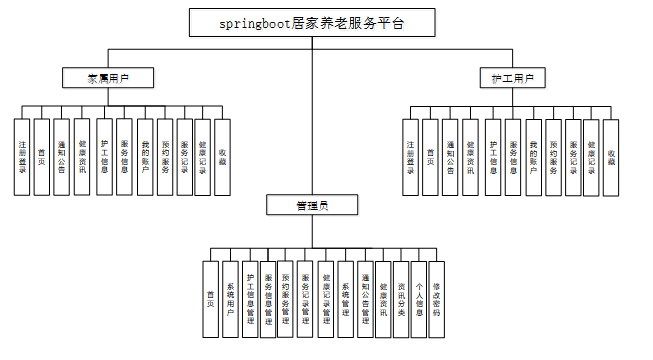 按照SpringBoot居家养老服务平台的角色,我划分为了家属用户模块、护工用户模块和管理员模块。