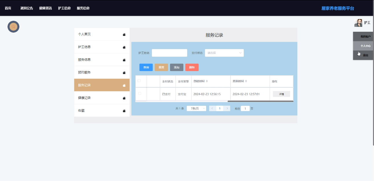 服务记录管理,护工用户可以查看服务记录管理详细信息,可以进行增删改查等操作,如图4-11所示