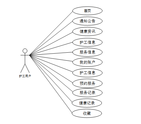 护工用户主要功能:首页、通知公告、健康资讯、护工信息、服务信息、我的账户、个人中心(个人首页、护工信息、服务信息、预约服务、服务记录、健康记录、收藏)等,护工用户用例如图2-6所示。
