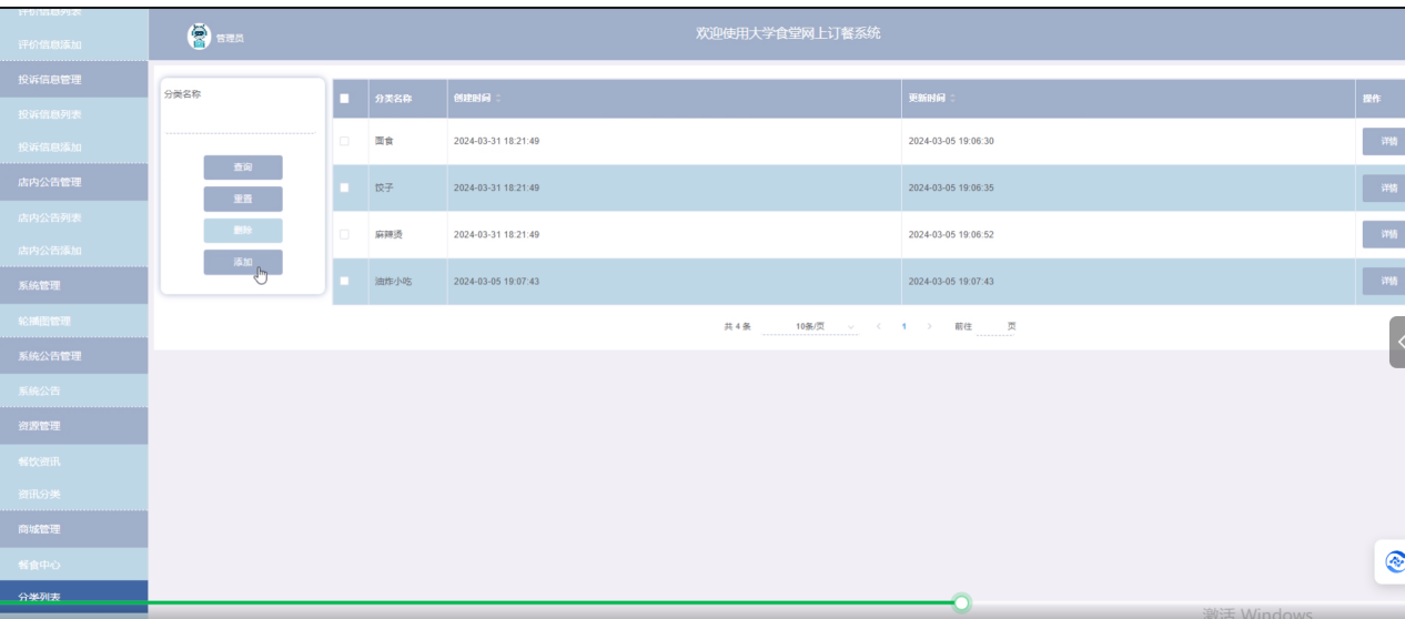点击“分类列表”这个菜单,可以查看分类名称、创建时间、更新时间等详情,并可以进行查询,重置、添加、删除等操作。分类列表界面如下图所示。
