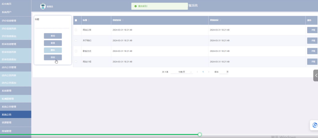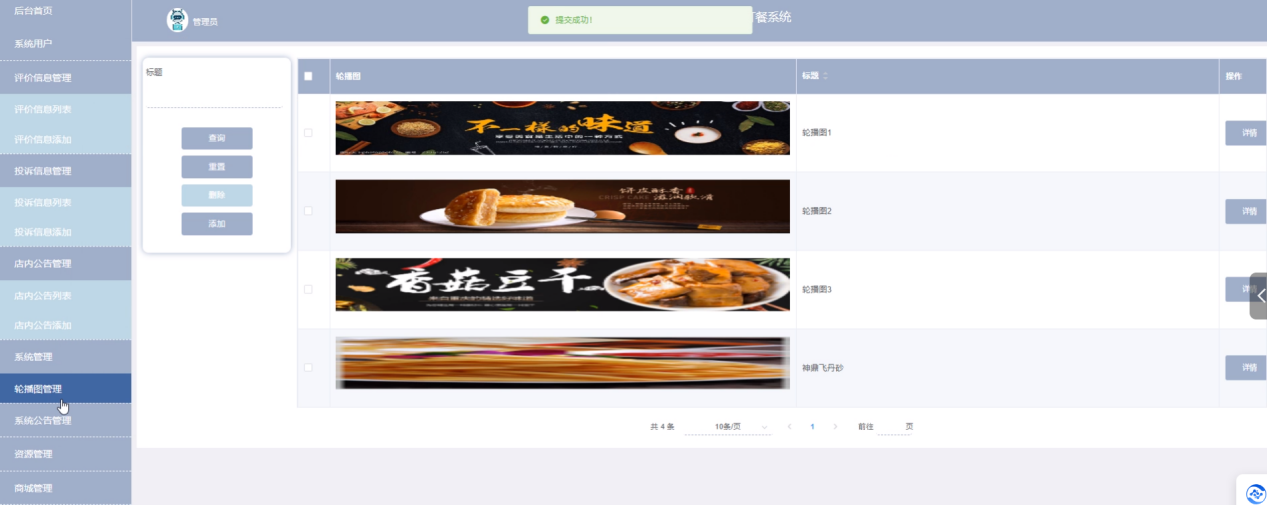 管理员可以对系统前台展示的轮播图进行增删改查,方便用户进行查看。系统管理界面如下图所示。