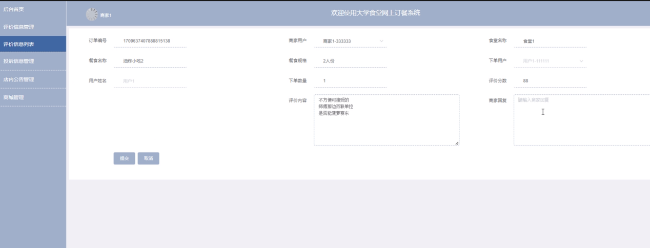 商家用户在后台点击“评价信息管理”这一菜单的时候,会出现评价信息列表这个子菜单,可以对用户的评论进行回复。评价信息管理如下图所示。