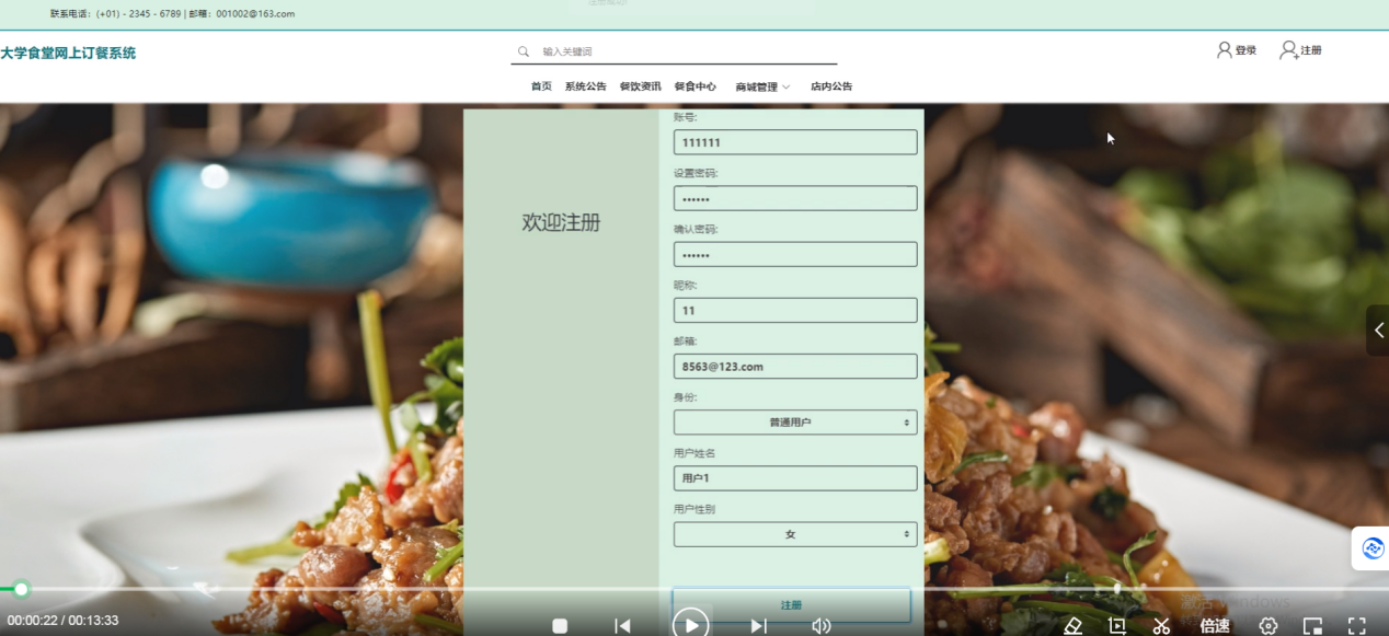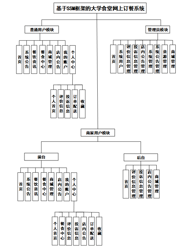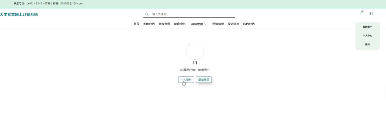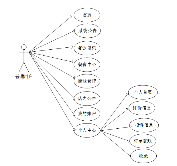 普通用户的功能:首页、系统公告、餐饮资讯、餐食中心、商城管理 、店内公告、我的账户、个人中心(个人首页、评价信息、投诉信息、订单配送、收藏)等功能。