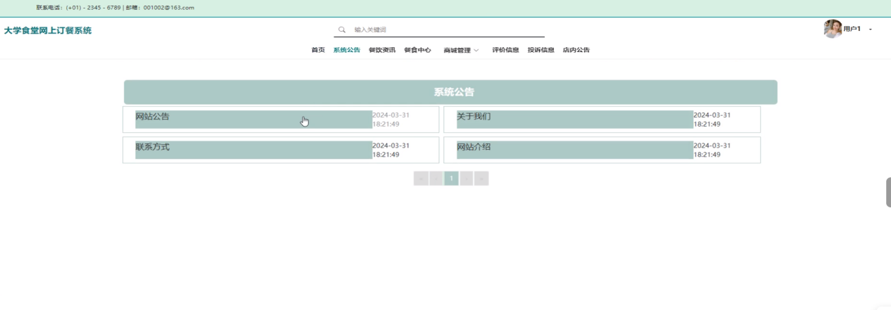 用户进行公告的阅览,查看管理者发布的网站公告、关于我们、联系方式、网站介绍等信息。系统公告界面图如下图所示。