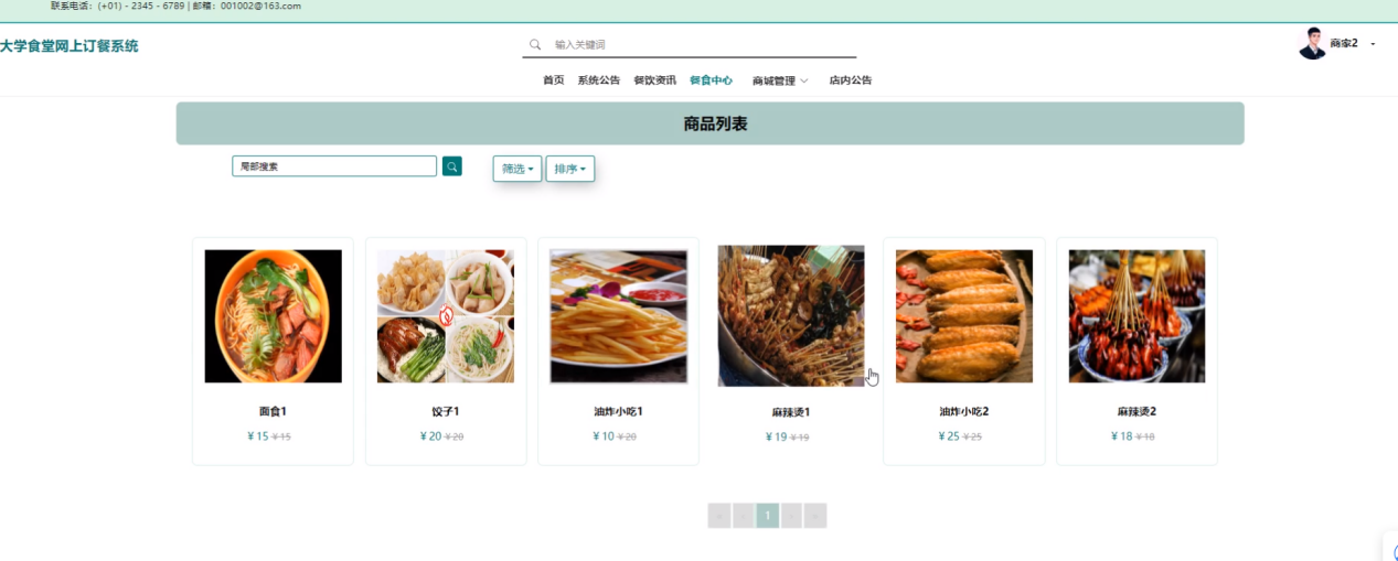 商家用户在前台页面可以查看对餐食中心所有在售商品,包括图片介绍及价格等。还可以查看用户的评论内容。餐食中心界面如下图所示。
