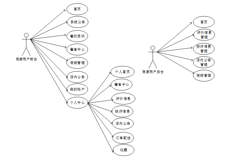 商家用户前台的功能:首页、系统公告、餐饮资讯、餐食中心、商城管理 、店内公告、我的账户、个人中心(个人首页、餐食中心、评价信息、投诉信息、店内公告、订单配送、收藏)等功能。