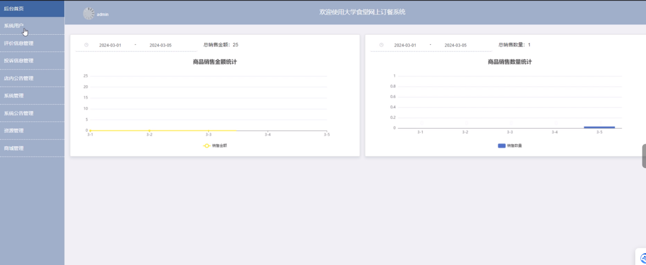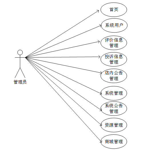 后台管理端的功能:后台首页、系统用户、评价信息管理、投诉信息管理、店内公告管理、系统管理、系统公告管理、资源管理、商城管理等功能。