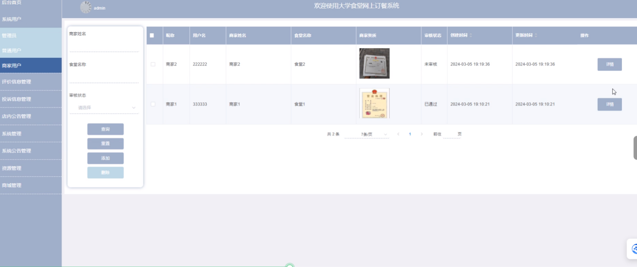 在系统用户页面中可以对管理员、普通用户、商家三种角色进行管控,还可以对三种角色进行查询、重置、添加和删除。系统用户界面如下图所示。