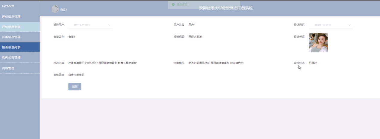 商家用户在后台点击“投诉信息管理”这一菜单的时候,会出现投诉信息列表这个子菜单,可以查看餐食的投诉信息,并进行审核回复。投诉信息管理如下图所示。