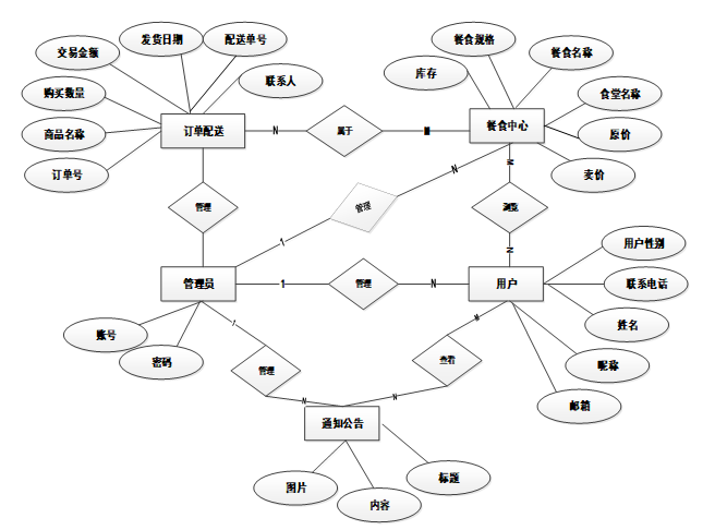 对于一个要开发的系统来说,E-R图可以让别人能更快更轻松的了解此系统的事务及它们之间的关系。根据系统分析阶段所得出的结论确定了在大学食堂网上订餐系统中存在着多个实体分别是用用户、管理员、订单配送、通知公告、餐食中心等。
