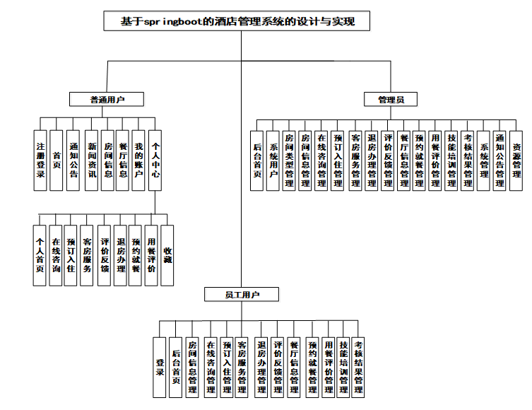 该系统主要包括系统用户、房间类型管理、房间信息管理、在线咨询管理、预订入住管理、客房服务管理、退房办理管理、评价反馈管理、餐厅信息管理、预约就餐管理、用餐评价管理、技能培训管理、考核结果管理、系统管理、通知公告管理等模块。通过Spring Boot框架的微服务架构,系统能够实现模块化开发,确保各功能模块之间的独立性和可扩展性。此外,系统采用RESTful API与前端进行交互,实现了用户友好的界面和流畅的操作体验。