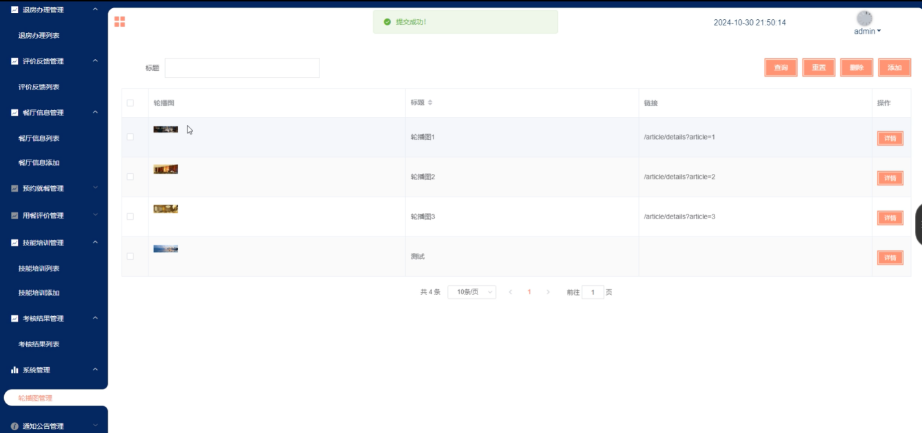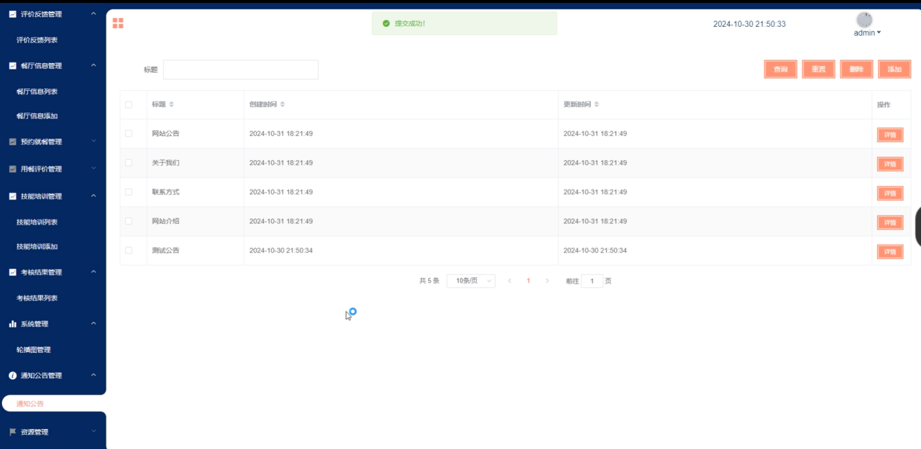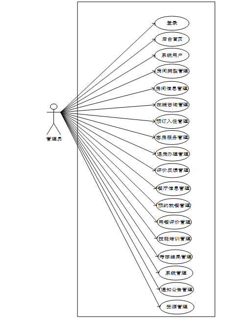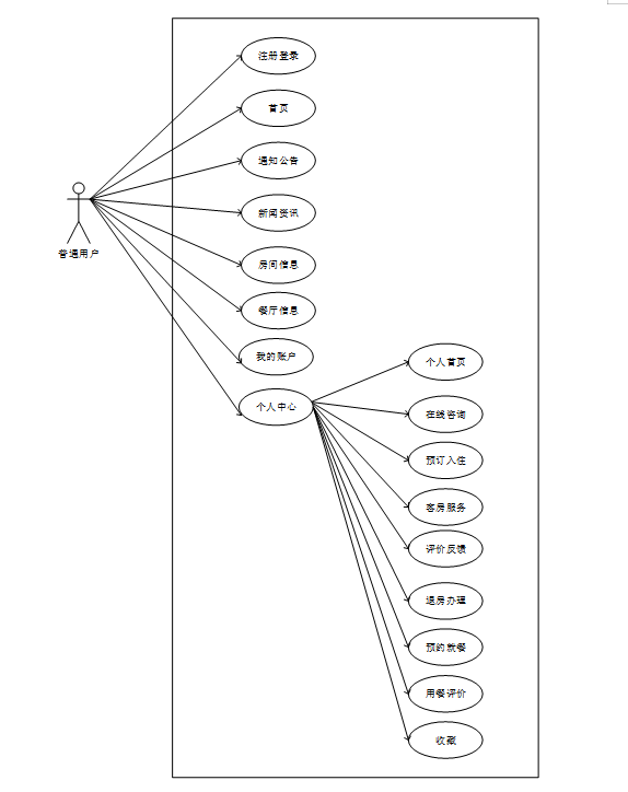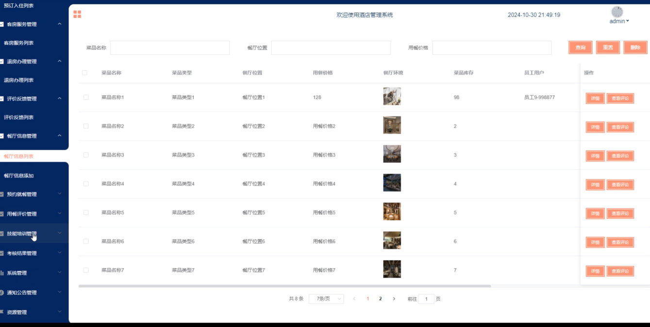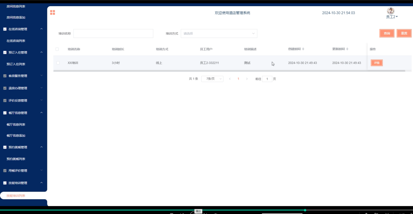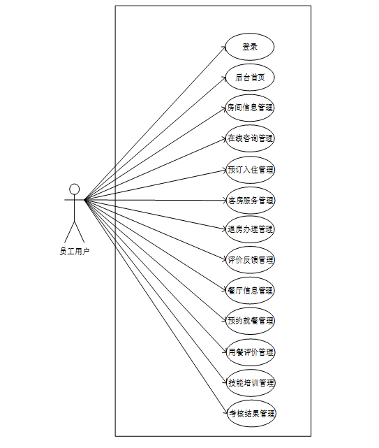 The system mainly includes modules such as system user, room type management, room information management, online consultation management, reservation and check-in management, room service management, check-out management, evaluation feedback management, restaurant information management, reservation and dining management, dining evaluation management, skill training management, assessment result management, system management, and notification and announcement management. Through the microservice architecture of the Spring Boot framework, the system can achieve modular development, ensuring independence and scalability between various functional modules. In addition, the system uses RESTful API to interact with the front-end, achieving a user-friendly interface and smooth operating experience.