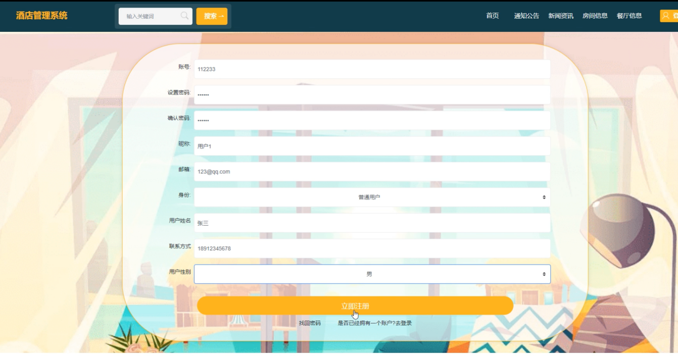 After system design and implementation, and testing, the results show that the hotel management system can effectively improve the operational efficiency of the hotel, simplify management processes, and enhance customer satisfaction. This system is not only suitable for small and medium-sized hotels, but also has a certain degree of scalability, which can provide support for larger scale hotels.