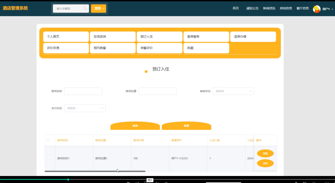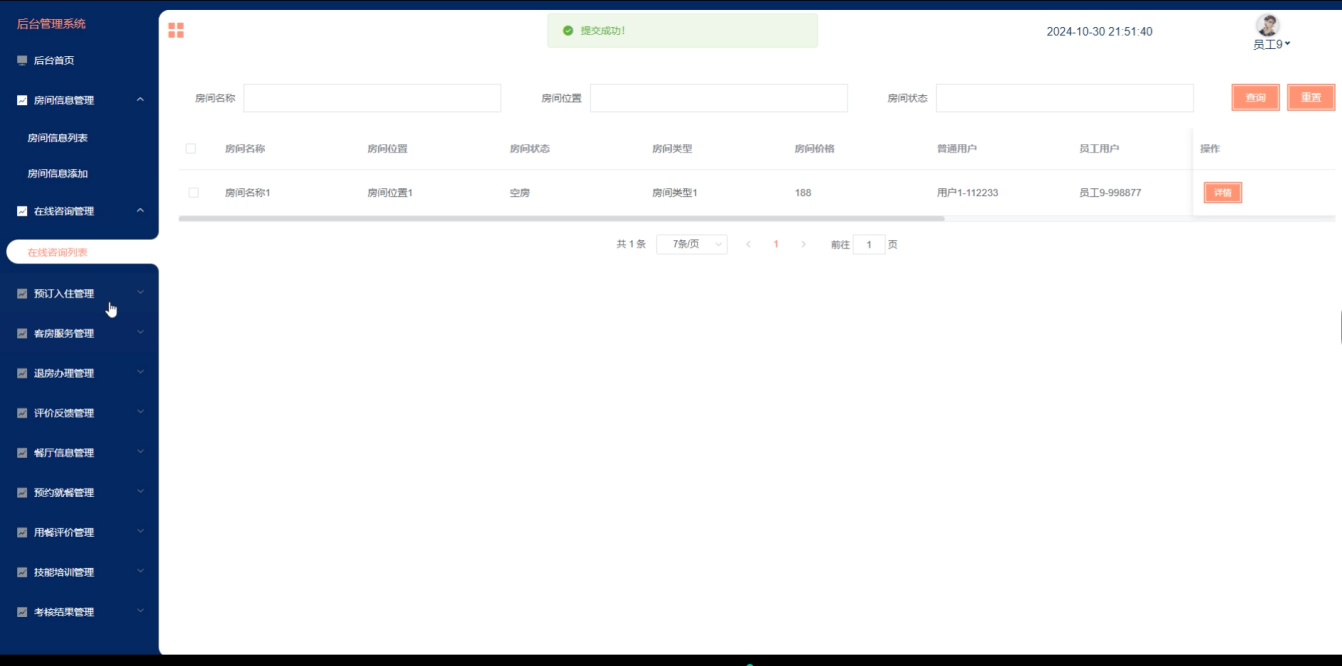 该系统能够有效整合酒店的各类资源,包括房间类型管理、房间信息管理、在线咨询管理、预订入住管理、客房服务管理、退房办理管理、评价反馈管理、餐厅信息管理、预约就餐管理、用餐评价管理、技能培训管理、考核结果管理等,实现资源的优化配置。通过自动化处理日常事务,系统大大减少了对人工操作的依赖,从而降低了人力成本,提高了工作效率。同时,实时更新的数据处理能力确保了信息的准确性和时效性,为酒店管理层提供了有力的决策支持工具。