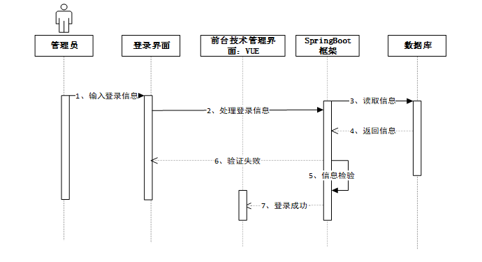 管理员输入登录信息后,登录界面将信息传递至前台管理界面,随后通过SpringBoot框架读取数据库中的用户信息并返回。系统验证信息,若验证成功则登录成功,若验证失败则返回错误提示。登录时序图如图4-4所示。