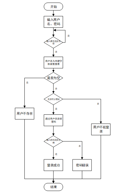 用户输入用户名和密码后,系统先检查输入是否为空,再验证用户名是否存在,若存在则通过用户名获取密码并校验。若密码正确则登录成功,否则提示密码错误。若用户名不存在或无法登录,提示用户操作无效。如图3-4所示。