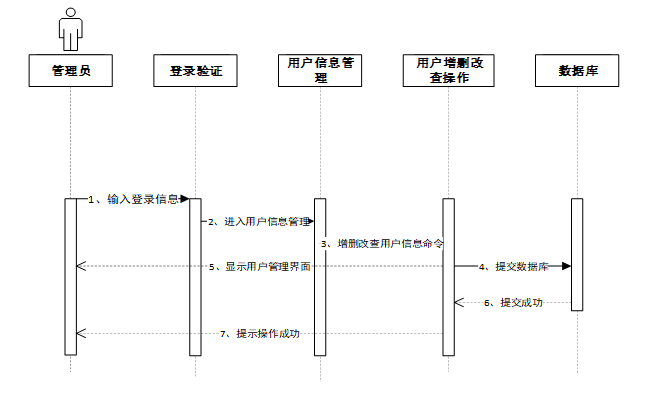 管理员输入登录信息后,进入用户信息管理模块,选择增删改查操作并提交命令至数据库。数据库执行操作后返回成功状态,系统显示用户管理界面并提示操作成功。管理员修改用户信息时序图如图4-5所示。