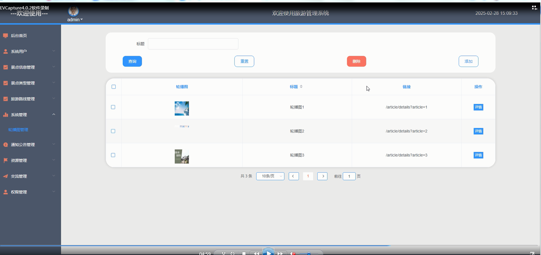 管理员点击“系统管理”菜单,可以对前台展示的轮播图进行设置,系统管理界面如下图所示。