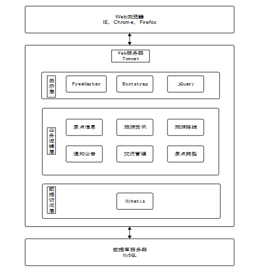 系统由表现层、业务逻辑层、数据访问层和数据库服务器组成。表现层通过浏览器(如IE、Chrome、Firefox)与用户交互,采用FreeMarker、Bootstrap、jQuery等技术实现界面呈现。业务逻辑层负责处理系统的核心业务逻辑,通过分模块设计实现功能分离。数据访问层使用MyBatis框架连接数据库,执行数据的增删改查操作。数据库服务器采用MySQL进行数据存储和管理,为系统提供稳定的数据库支持。整个架构通过Tomcat服务器完成用户请求的接收和处理,确保系统的高效运行[8]。整个系统架构如图4-1所示。