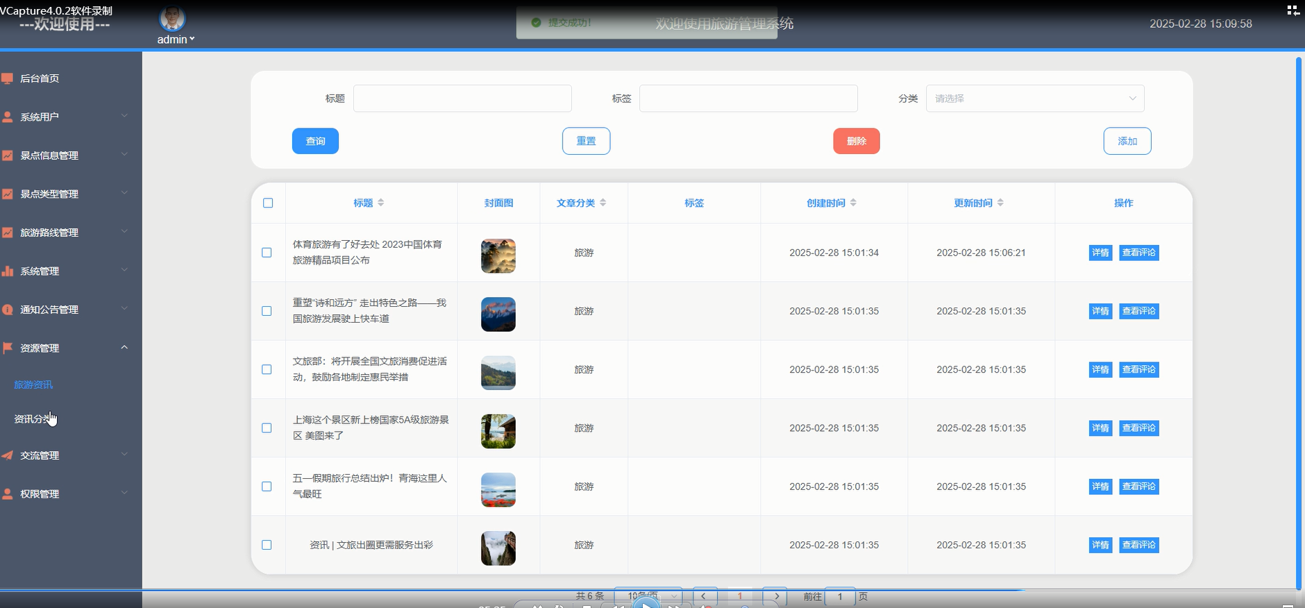 管理员在资讯管理页面查看所有把旅游资讯文章,支持新增、编辑和删除操作。点击“新增”填写标题、内容并上传图片,选择分类后发布。可批量删除过期文章。资讯管理界面如下图所示。