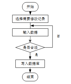 用户首先选择需要修改的记录,输入修改后的数据,系统判断输入数据是否合法。若数据不合法,提示重新输入;若数据合法,则将修改后的数据写入数据库,完成操作后流程结束。修改信息流程图如图3-7所示。