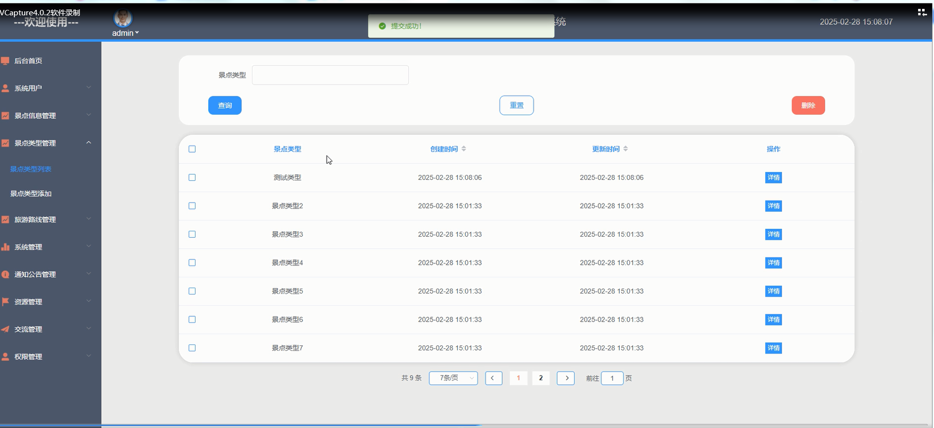 管理员点击“景点类型管理”这一菜单会显示景点类型列表和景点类型添加两个子菜单,点击“景点类型列表”可以查看景点类型详情,可以进行查询、重置、删除等操作。点击“景点类型添加”,管理员可以添加新的景点类型。景点类型管理界面如下图所示。