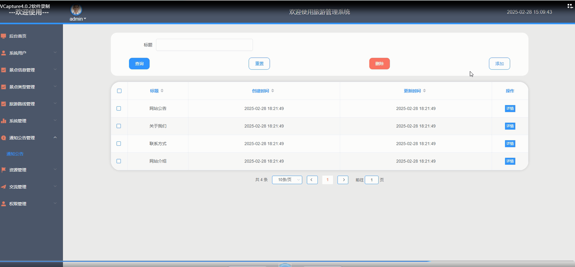 管理员点击“通知公告管理”这个菜单,可以对系统中的通知公告进行管理,包括通知公告的增删改查等操作。通知公告管理界面如下图所示。