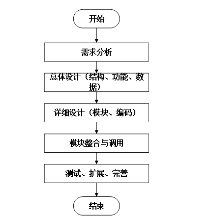 系统开发流程的主要步骤,从需求分析到系统完成的全过程。流程包括需求分析、总体设计(结构、功能、数据)、详细设计(模块、编码)、模块整合与调用,以及测试、扩展和完善,最终完成系统的开发。本系统的开发流程如图3-3所示