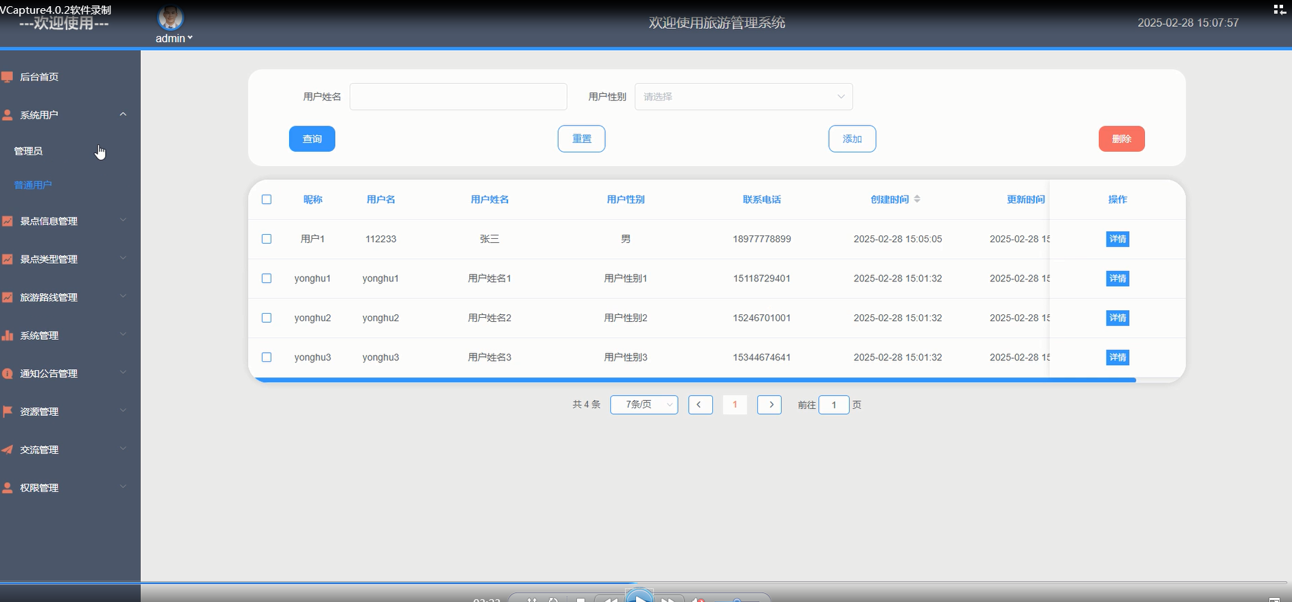 The system is designed with a front-end and back-end separation architecture, which makes the system functional modules independent, easy to maintain and expand. The administrator end is mainly responsible for managing backend data and system configuration, while the regular user end focuses on improving user experience, providing convenient query and interactive functions. The system has a good user interface and data processing capabilities, which can effectively improve the efficiency of tourism management and provide users with more intelligent tourism services.