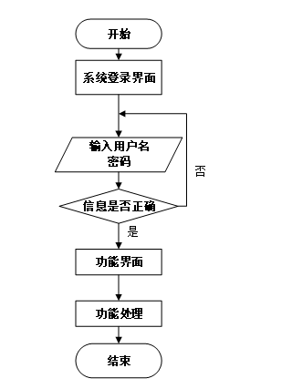 用户首先进入系统登录界面,输入用户名和密码后,系统验证信息是否正确。若验证失败,返回登录界面重新输入;若验证成功,则进入功能界面,执行相应功能处理后结束操作流程。操作流程如图3-5所示。