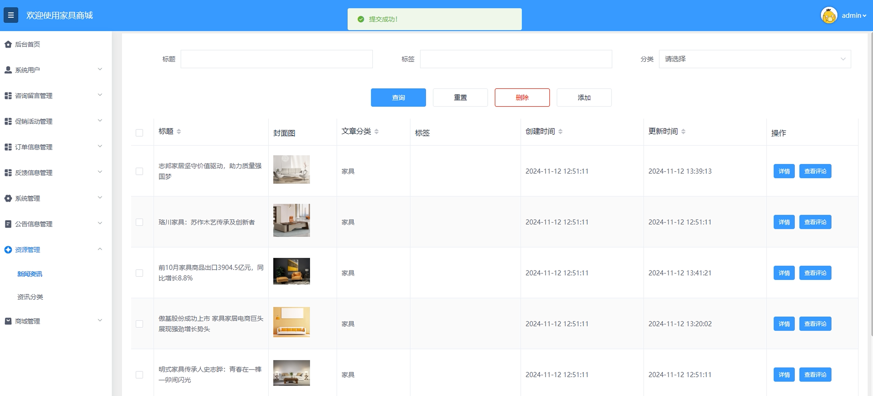 (3)资源管理:包含新闻资讯跟资讯分类,新闻资讯可查看资讯详情与评论,以及查询、重置、删除、添加等操作。资讯分类:可查看资讯分类详情,以及查询、重置、删除、添加等操作。