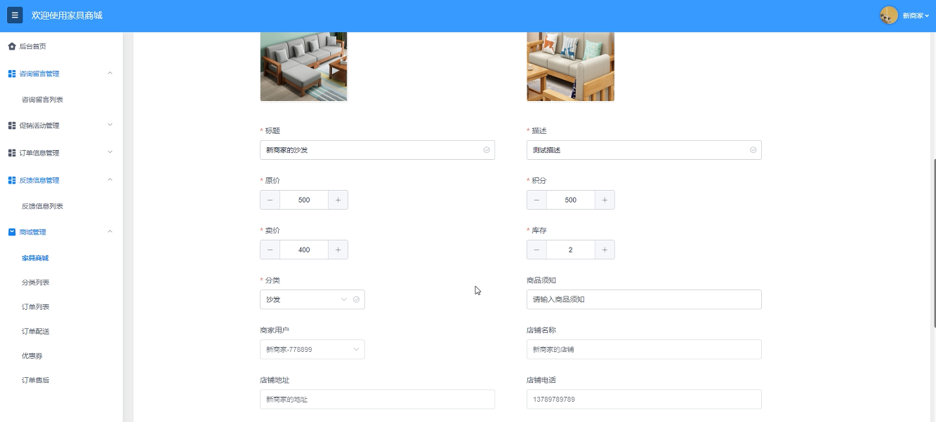 (5)家具商城管理:商家用户管理商品信息,如上下架、库存调整、价格设置等,并进行增删改查等操作。
