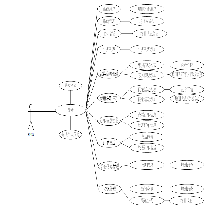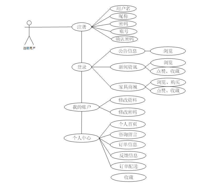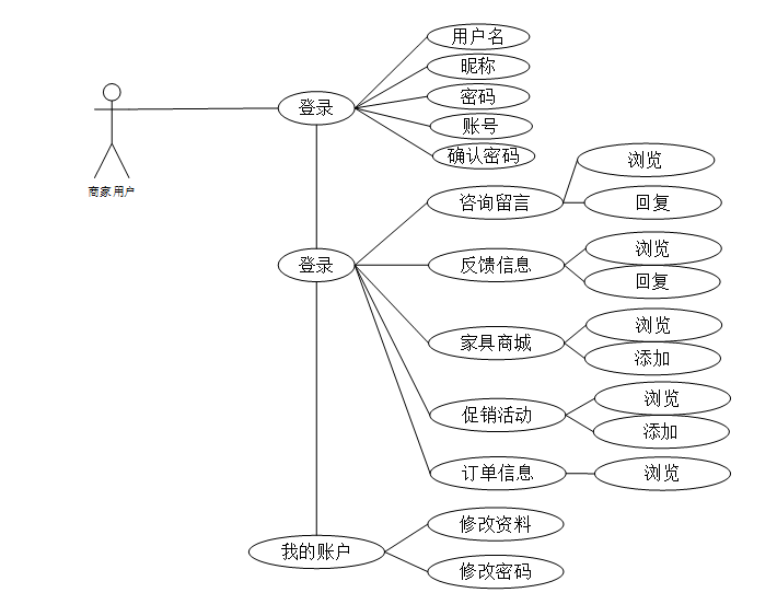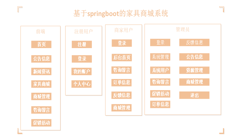基于Spring Boot 的家具商城系统的设计与实现包含前端跟后端,其中还后端包含注册用户、商家和管理员三个角色划分,主要功能如下: